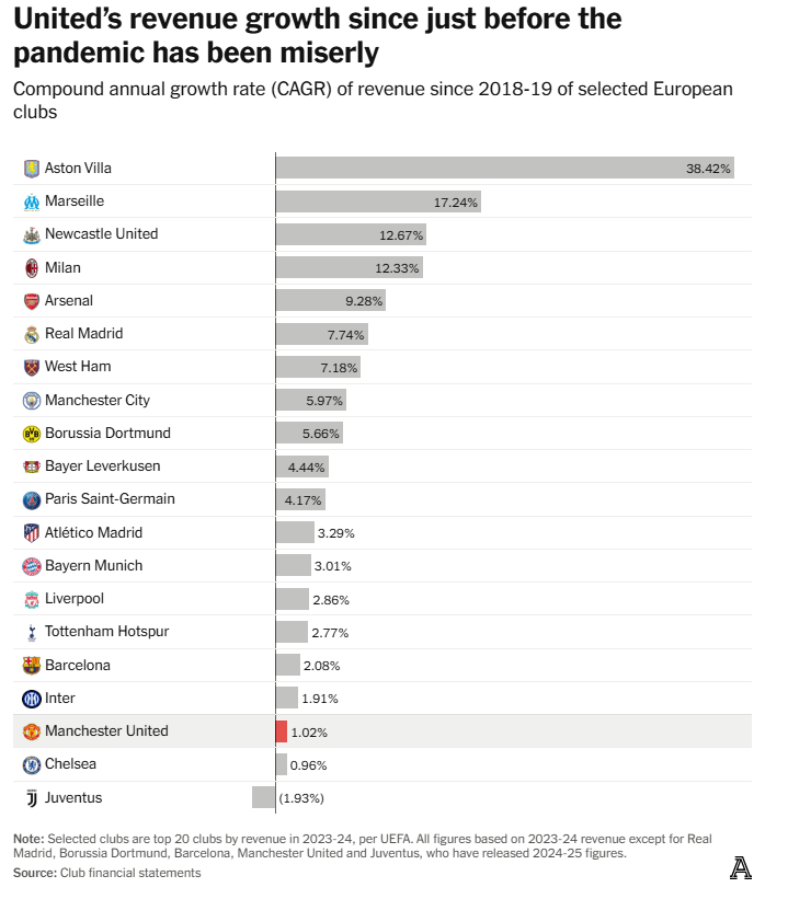 在2019-20赛季新冠疫情爆发之前,曼联的收入为6.271亿英镑。在此后的六年里,收入仅增长了3940万英镑,复合年增长率(CAGR)仅为1.02%。