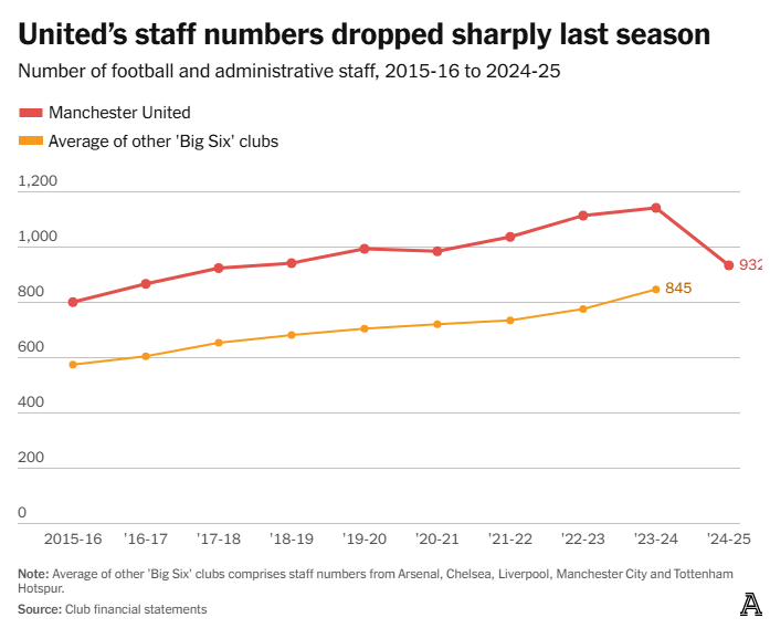 全职员工减少了18%,但与Big6的其他球队相比,拉特克利夫和他的团队仍然认为有需要削减的地方。曼联上赛季的足球和行政人员人数为932人,高于其他五家俱乐部最近的平均水平。