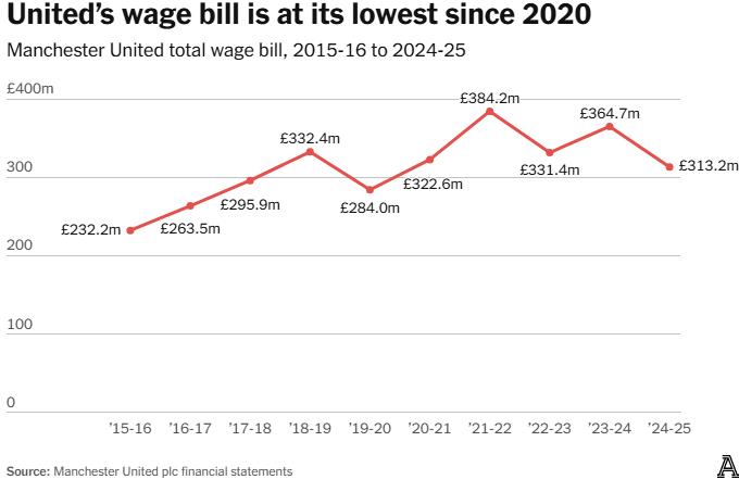 曼联的雇员人数对于理解其总工资支出至关重要,其总工资支出为3.133亿英镑,下降了5150万英镑(14%),处于2019-20赛季以来的最低点。