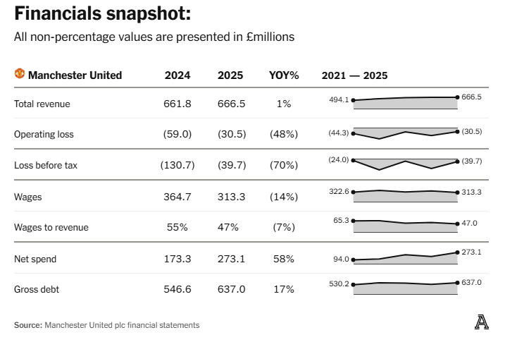 削减成本的规模已经产生了显著的影响。曼联的运营亏损减少了一半,至3050万英镑,这是五年来的最好账面数据。