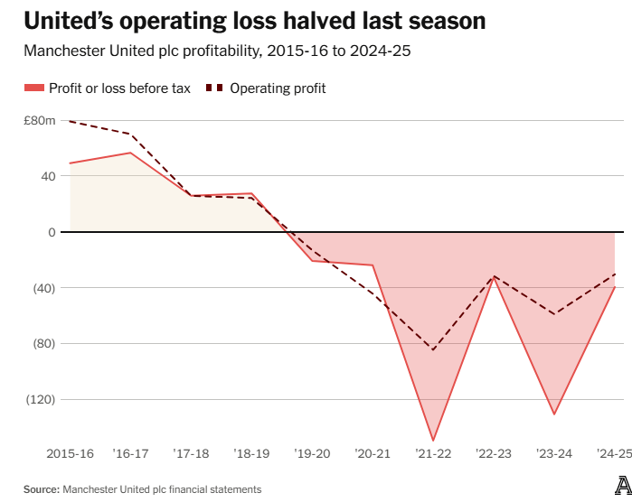 去年10月解雇主教练埃里克-滕哈格和他的幕后团队,几周后又解雇了体育总监丹-阿什沃斯,这意味着1450万英镑的特殊成本,使运营亏损增加了约50%,而如果没有解雇主教练,运营亏损会下降48%。