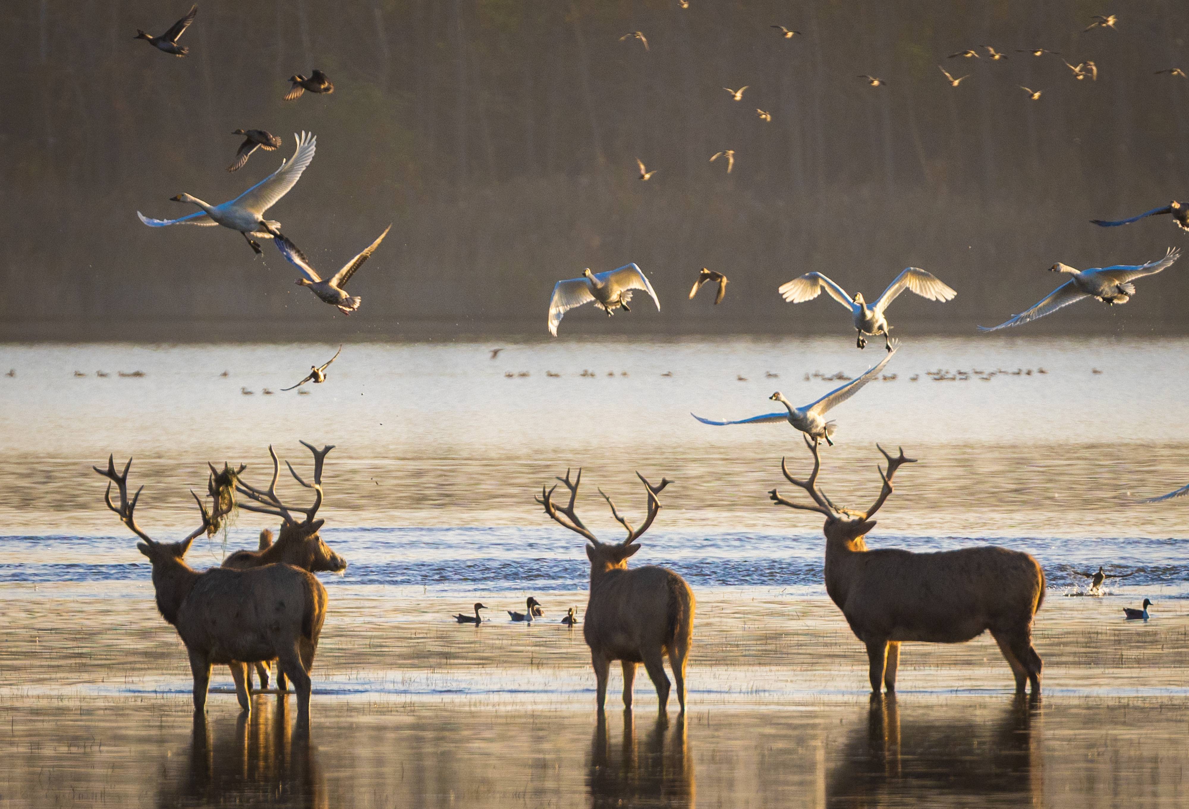 石首天鹅洲湿地麋鹿国家级自然保护区的麋鹿达4500余头,其中野外扩散种群达1600余头。除保护区外,形成了石首三合垸、杨波坦,监利兔儿洲和湖南洞庭湖四个自然扩散种群,遍及鄂湘两省十余县市,成为全球最具规模与活力的野生麋鹿种群。 (摄影:湖北日报全媒记者 柯皓 制图:万璇)